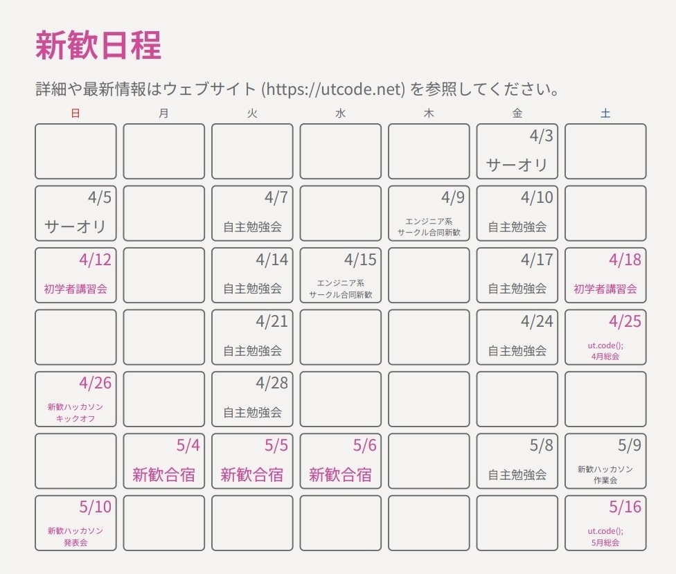 ut.code(); の普段の活動を知ることができますし、部員や他の新入生とも交流できるいい機会になります! ぜひご参加ください! - 参加募集フォームはこちら